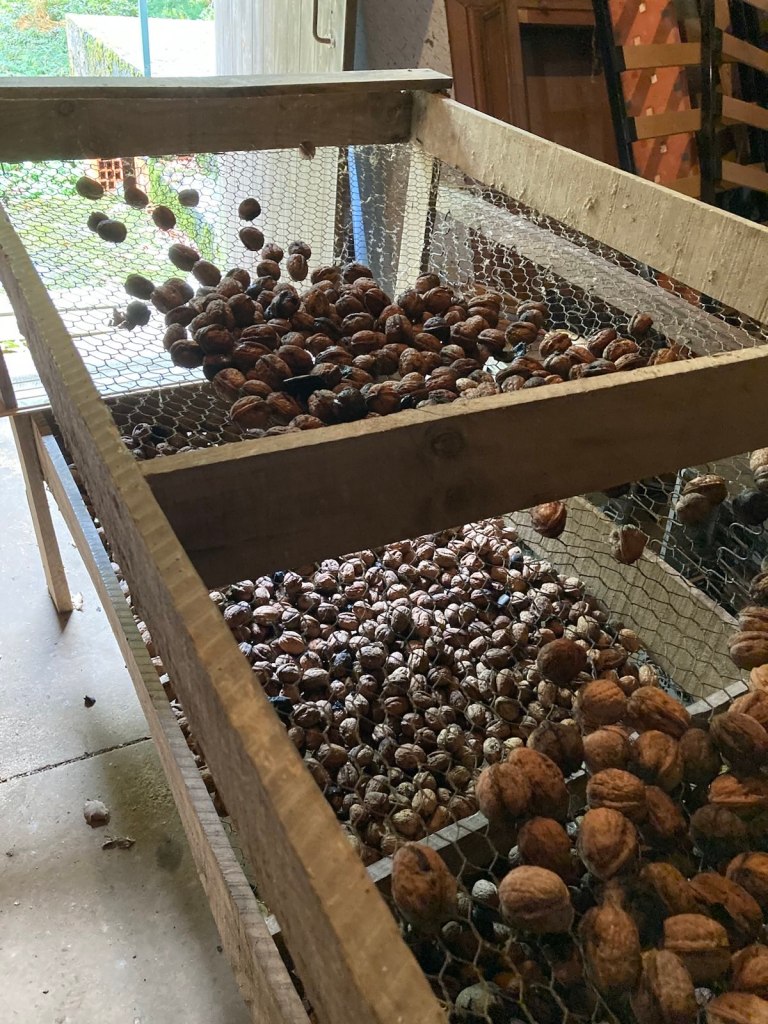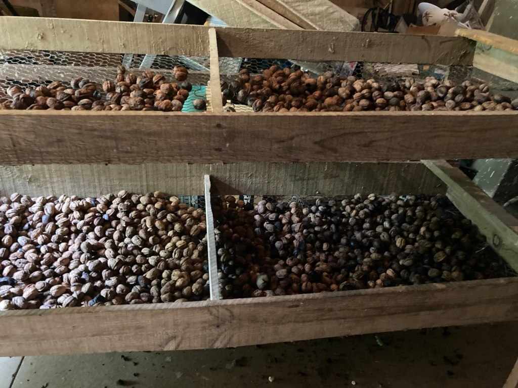 Dag 4: Walnoten verzamelen met deze leuke gadget. Daarna worden ze naar de droogkamer gebracht en uitgespreid op deze droogtafels van gaas.