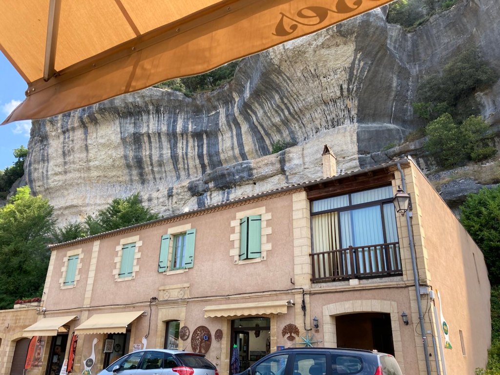 Since it’s raining nonstop the building site is empty and forlorn. So here are a few photos of my village, Les Eyzies de Tayac in the Dordogne on a nicer day. The statue is an image of the Cro-Magnon man who was discovered just a kilometer up the road.